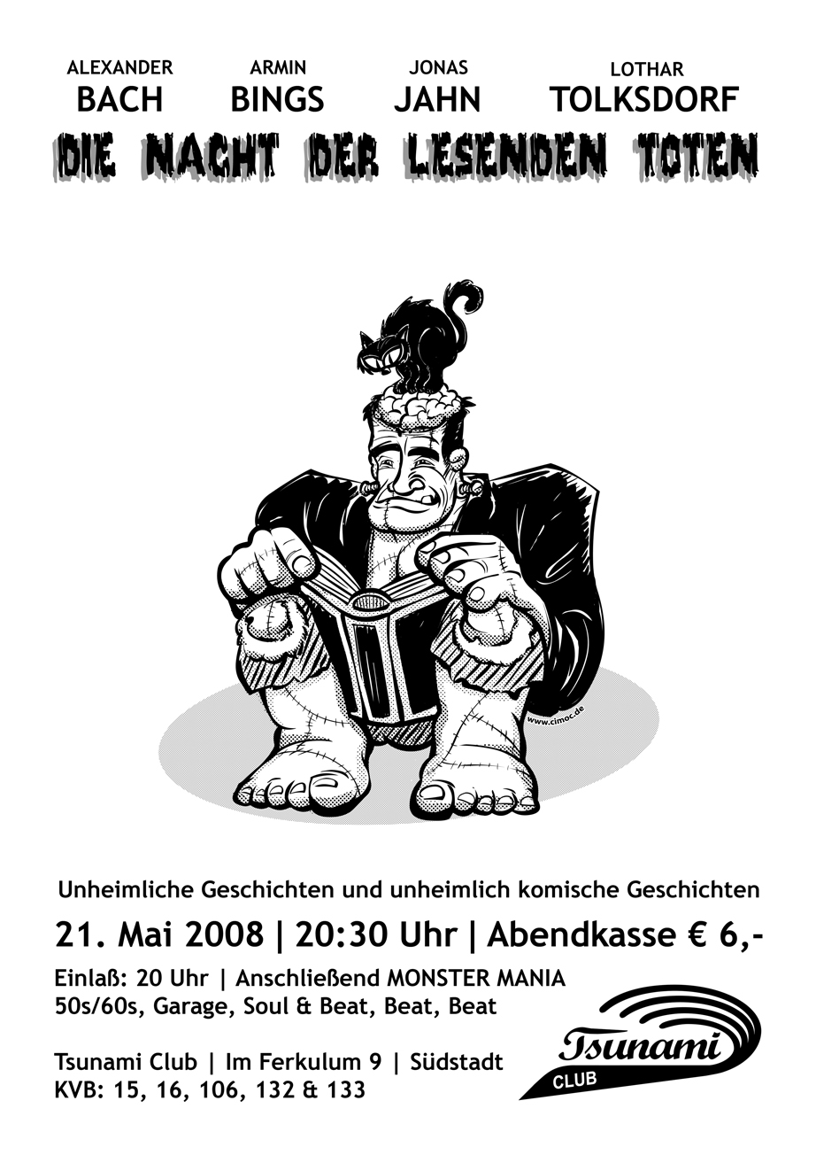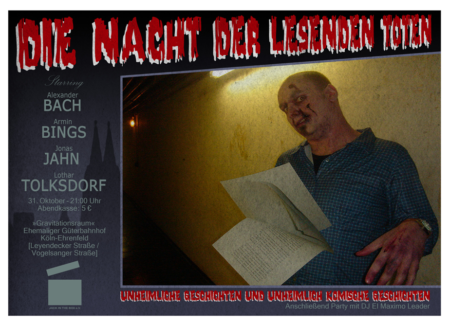 Die Nacht der lesenden Toten21. Mai 2008 / Tsunami Club, Köln 31. Oktober 2007 / Gravitationsraum auf dem ehemaligen Güterbahnhof Köln-Ehrenfeld, KölnKurzinfoAlexander Bach, Armin Bings, Jonas Jahn und Lothar Tolksdorf verwandelten Halloween in Die Nacht der lesenden Toten. Die Spoken Word Autoren präsentierten unheimliche und unheimlich komische Geschichten, mit denen sie die rund 200 Zuschauer auf das Angenehmste und Gruseligste unterhielten. Erzählungen von Video Nasties und traumatischen Jugenderinnerungen, Parodien auf Klassiker des Horrorfilms und makabre Geschichten aus der Schattenwelt sorgten für eine schlaflose Nacht.Begeistert waren die Zuschauer, resümierte die Kölnische Rundschau, von amüsanten, oft satirisch überhöhten Kurzgeschichten und verlieh der Nacht der lesenden Toten das Prädikat äußerst lebendig!KünstlerAlexander Bach, Armin Bings, Jonas Jahn, Lothar TolksdorfPressespiegelNacht der lesenden Toten Unheimliches und unheimlich Komisches zu Allerheiligen Kölnische Rundschau, 8. November 2007HörprobeDie Nacht der lesenden Toten - IntroVideosAlexander Bach - BesessenArmin Bings - Der blanke HorrorArmin Bings - Der PiratJonas Jahn - Fingerkloppe auf HannoveranischJonas Jahn - Celia-ViviLothar Tolksdorf - Heinrich, mir graut vor DirJonas Jahn - Zwei Hexen u.a.WerbematerialDie Nacht der lesenden Toten - LobbycardDie Nacht der lesenden Toten - PlakatProgrammheftDie Nacht der lesenden Toten - Programmheft |